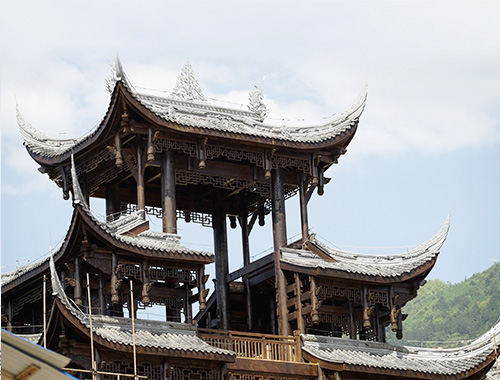 重庆黔江风雨廊桥位于重庆市黔江区濯水古镇,有“亚洲第一廊桥”之称,是当地的标志性建筑。廊桥横跨于阿蓬江上,长303米、宽5米,分为桥、塔、亭三部分。2013年11月28日的一场大火将“亚洲第一廊桥”毁于一旦。2016年起苏州园林发展股份有限公司中标承建风雨廊桥的修复,再现了 “亚洲第一廊桥”昔日风光。
